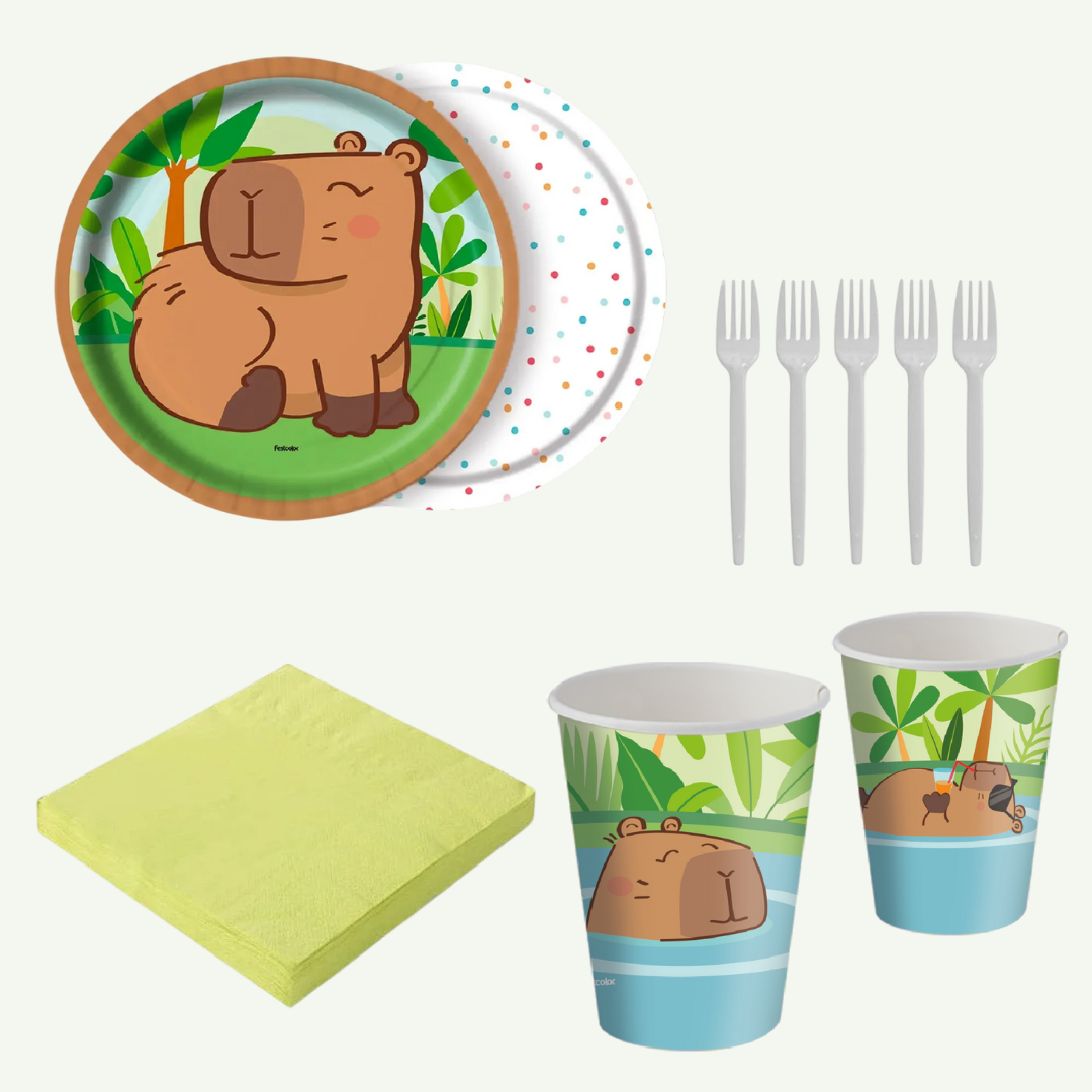 Sua festa vai ser um verdadeiro sucesso com esse kit completo, prático e cheio de personalidade! Com itens que combinam perfeitamente entre si, o Kit Festa Capivara é ideal para montar uma mesa linda, alegre e super fofa – tudo com o toque especial da capivara mais querida do Brasil! 🐹💚
