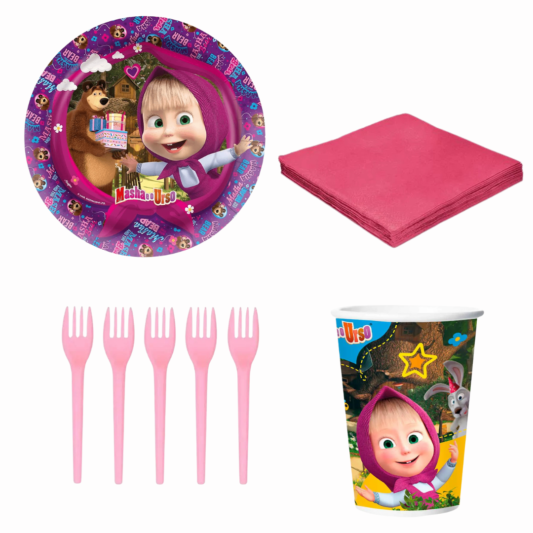 Com copos, pratos, guardanapos e garfinhos combinando, esse kit vai deixar a mesa do jeitinho que toda criança ama: linda, colorida e temática do jeitinho da Masha!